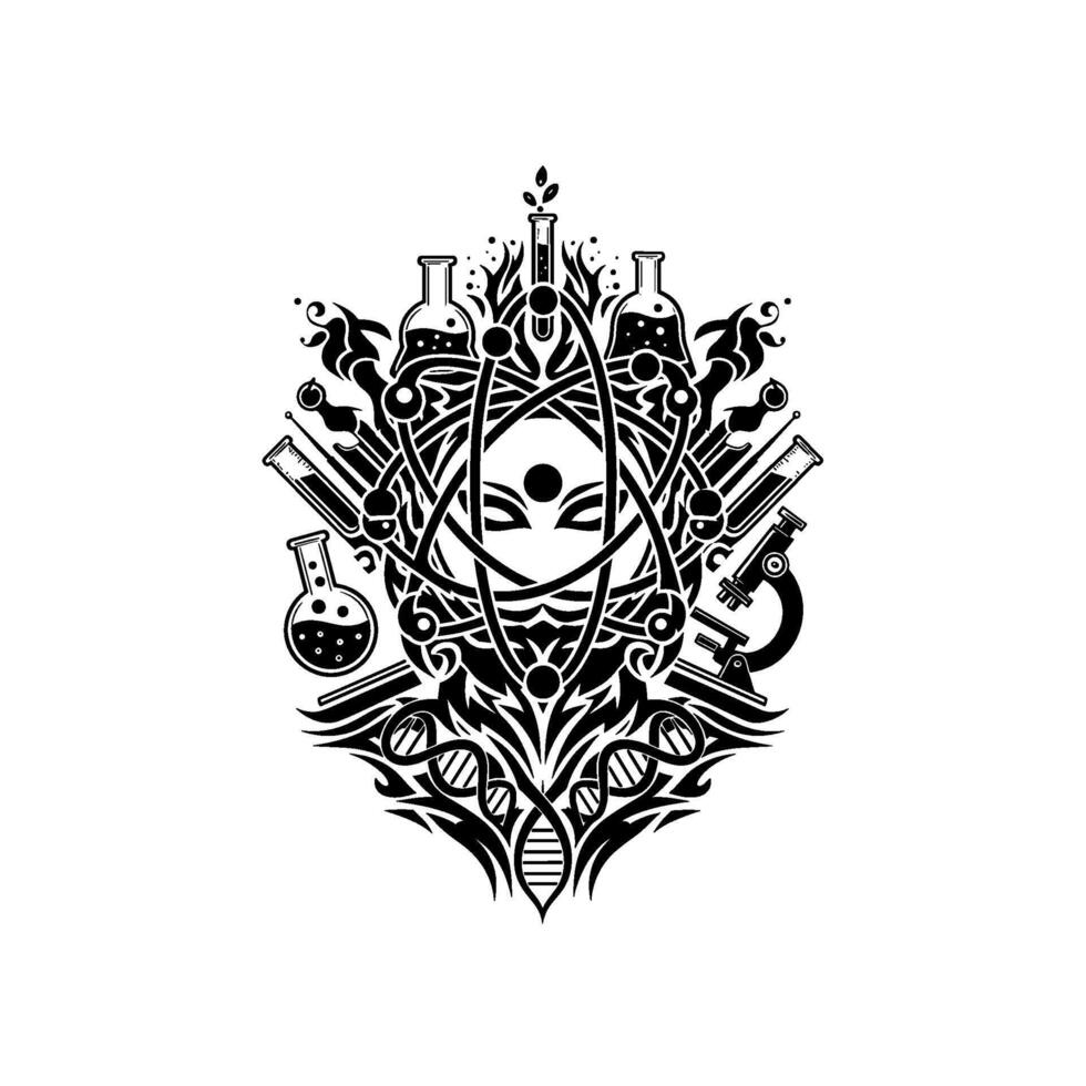 Abstract science emblem with dna, atom, microscope, and laboratory glassware isolated on white background Free Vector
