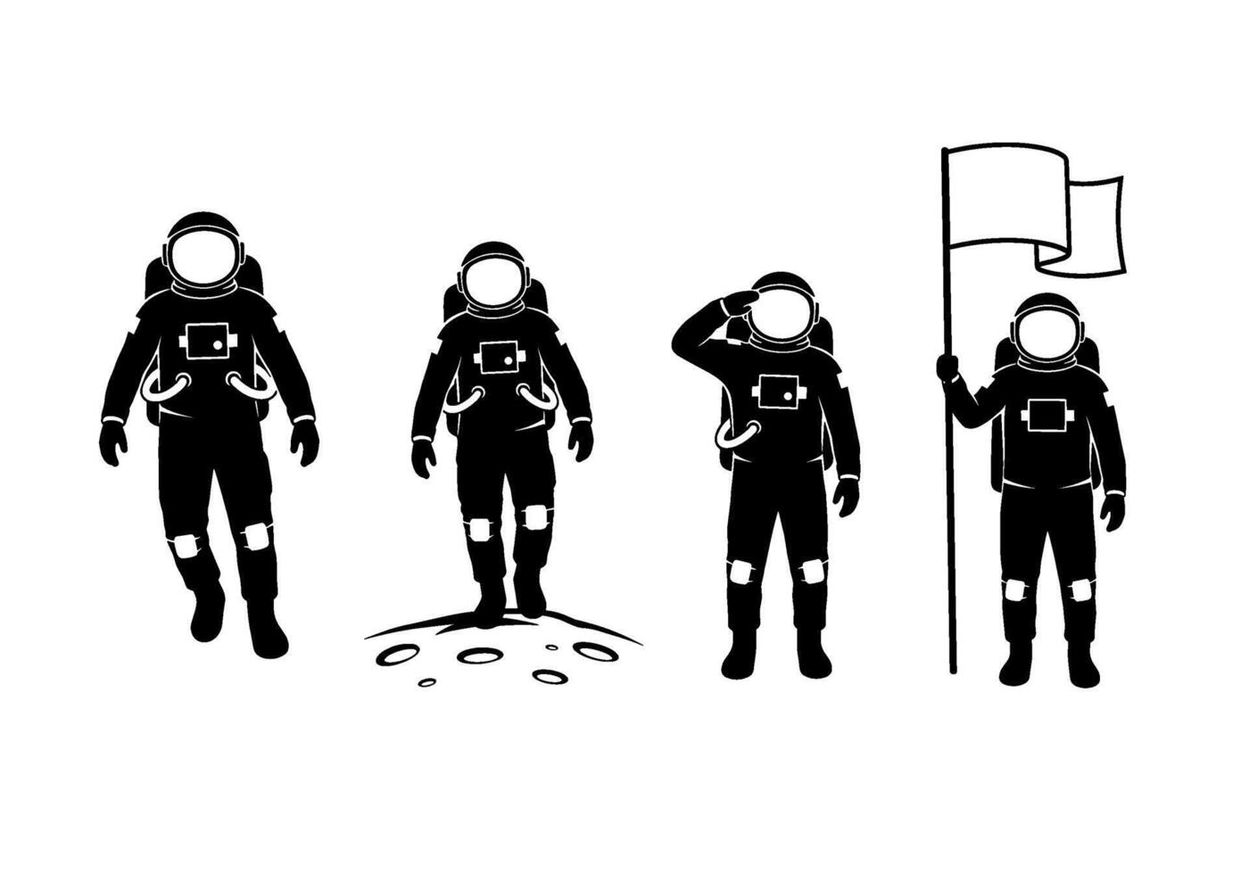 Astronauts exploring the lunar surface planting a flag and saluting in the desolate cratered landscape symbolizing space exploration and discovery Free Vector