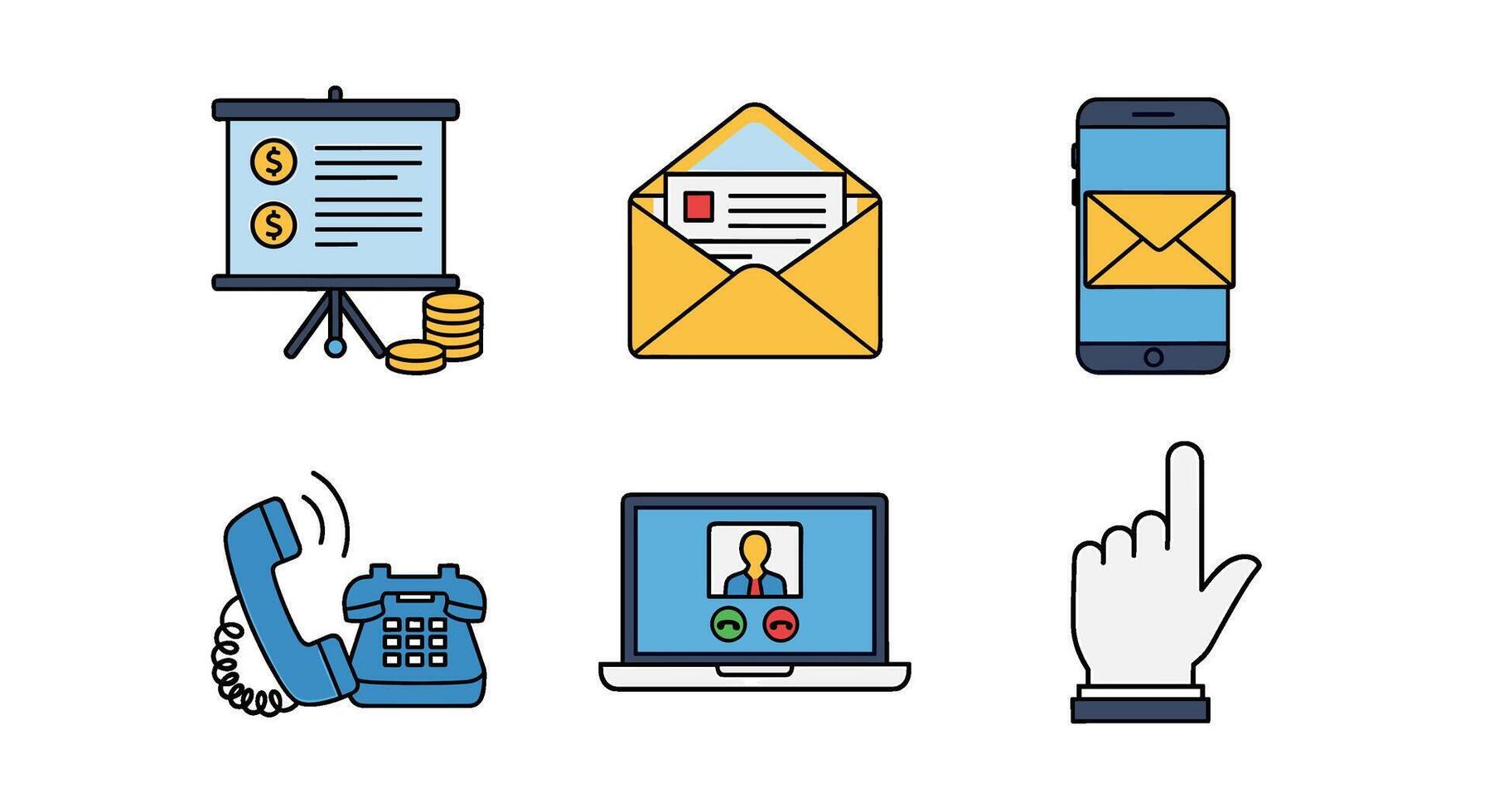 Set of business and communication icons including presentation, email, phone, call, and cursor, isolated on white background vector