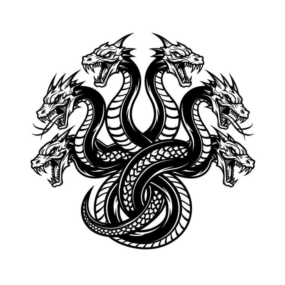 Mythical hydra with multiple serpent heads, intricately designed with sharp teeth and scales vector