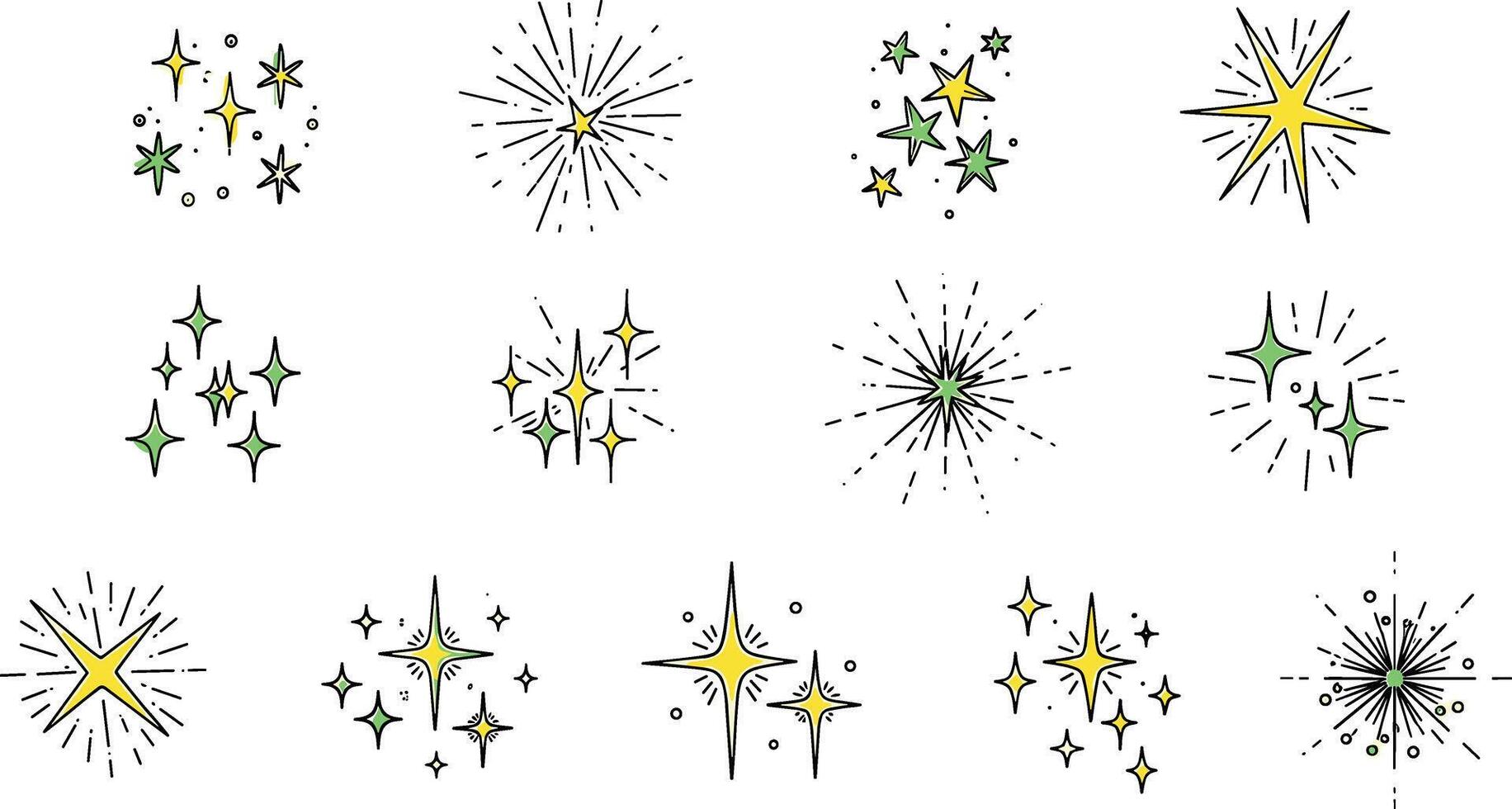 A diverse set of hand-drawn star and sparkle icons. Collection of yellow and green shining, twinkling, and bursting elements in a simple doodle style Pro Vector