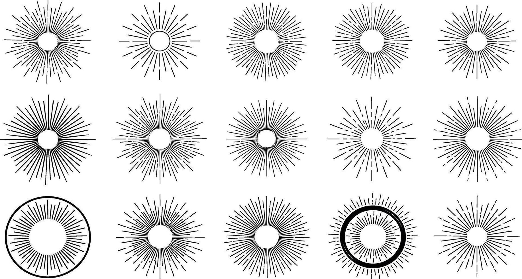 Set of abstract sunburst, starburst, and radial graphic elements for design with clean lines and geometric patterns Pro Vector