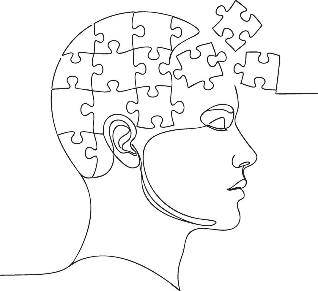 continuous line drawing of human head with puzzle pieces, mental health, problem solving concept vector
