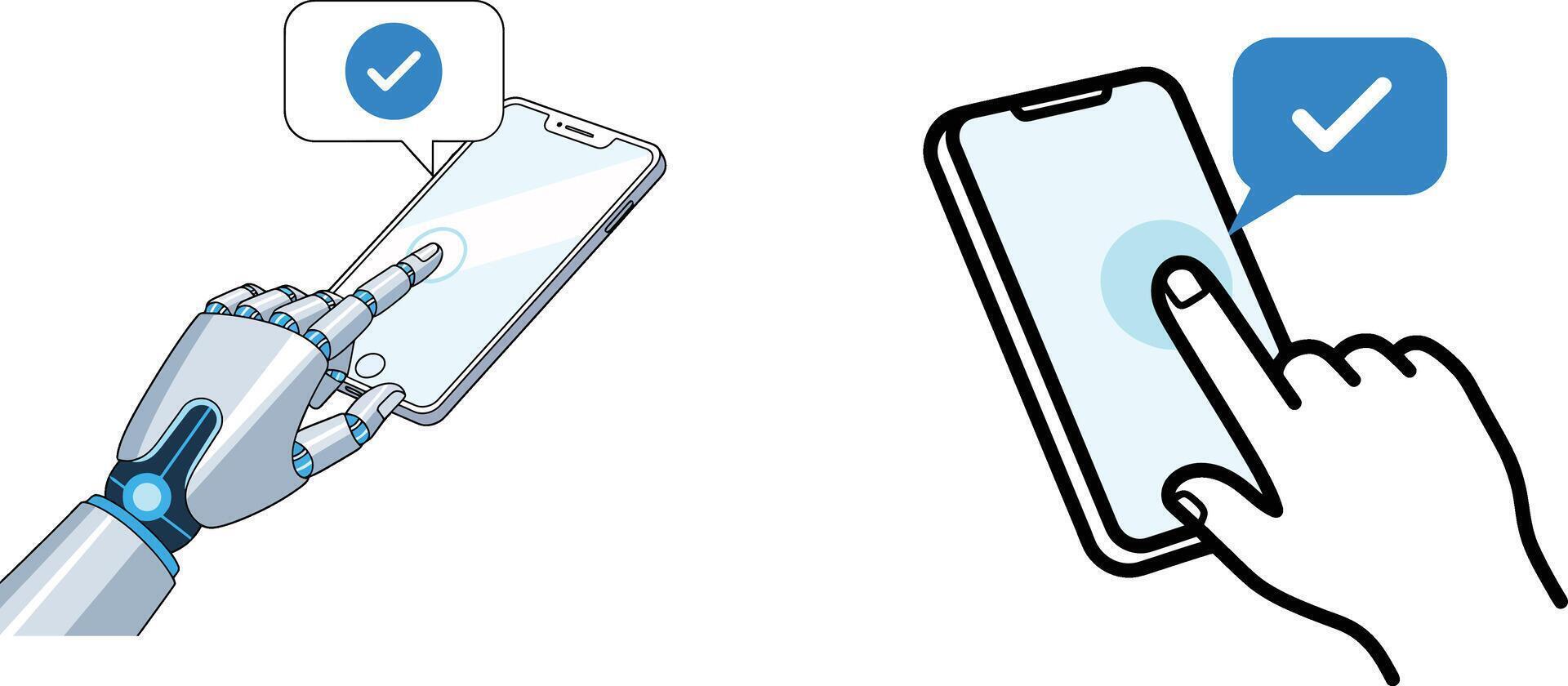 robot and human hands tapping smartphone, verified action, digital confirmation, ai interface, security vector