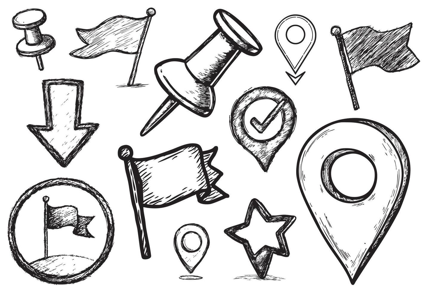 Handdrawn Sketchy Location Pin and Flag Pointer Icon Element Set Pro Vector