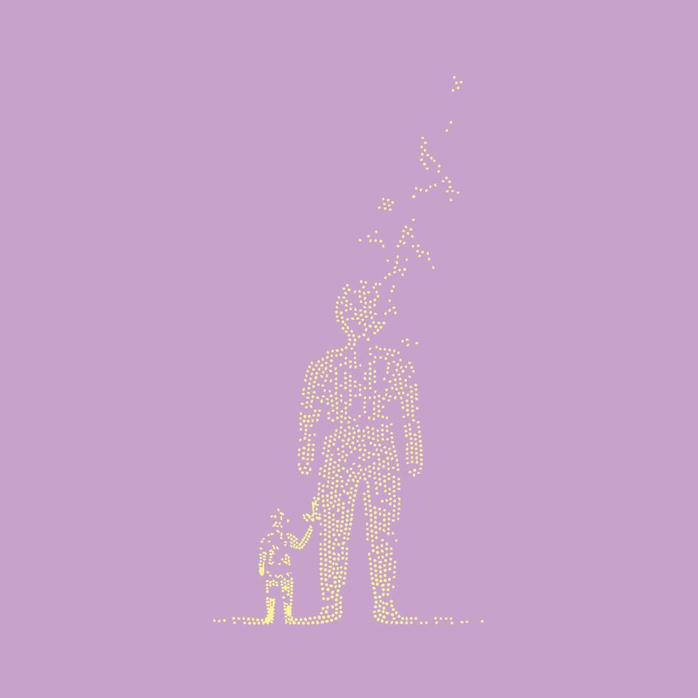 Abstract depiction of a large figure with a smaller figure beside it, composed of tiny dots on a soft purple vector
