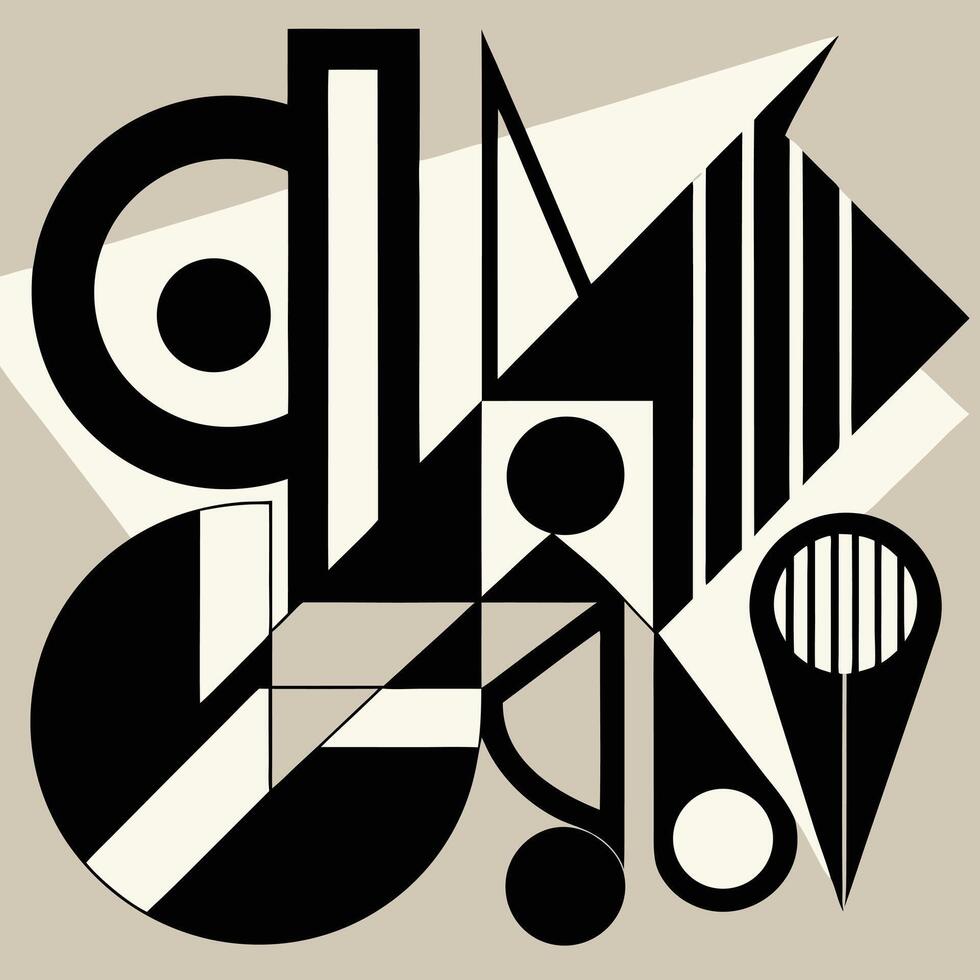 Illustration of abstract geometric composition with black and white shapes, lines, and circles, creating a dynamic and modern visual vector