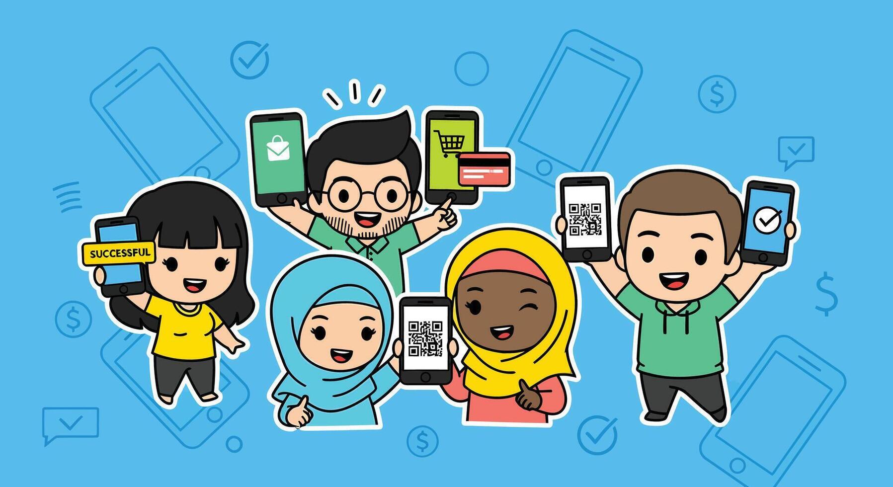 Mobile Payment Online Shopping cartoon with diverse people. Fintech concept with QR code, digital wallet, and e-commerc Pro Vector