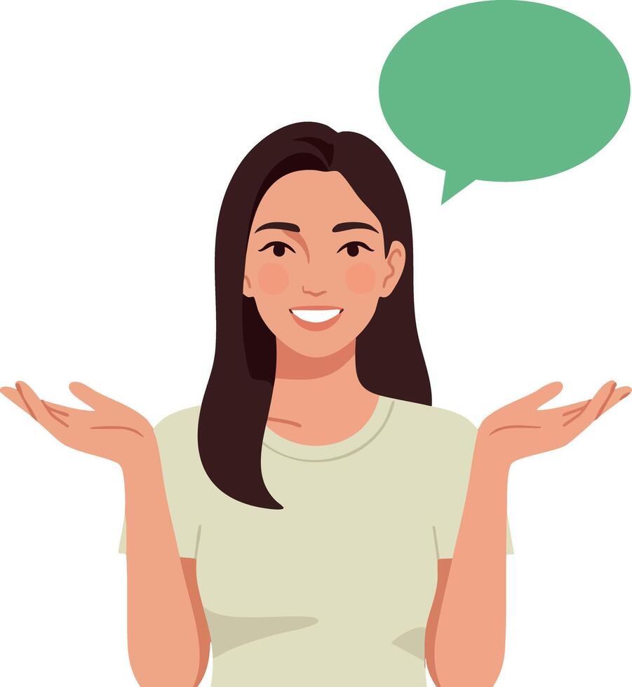 Woman with open hands and smiling face showing speech bubble illustration for communication and expression Pro Vector