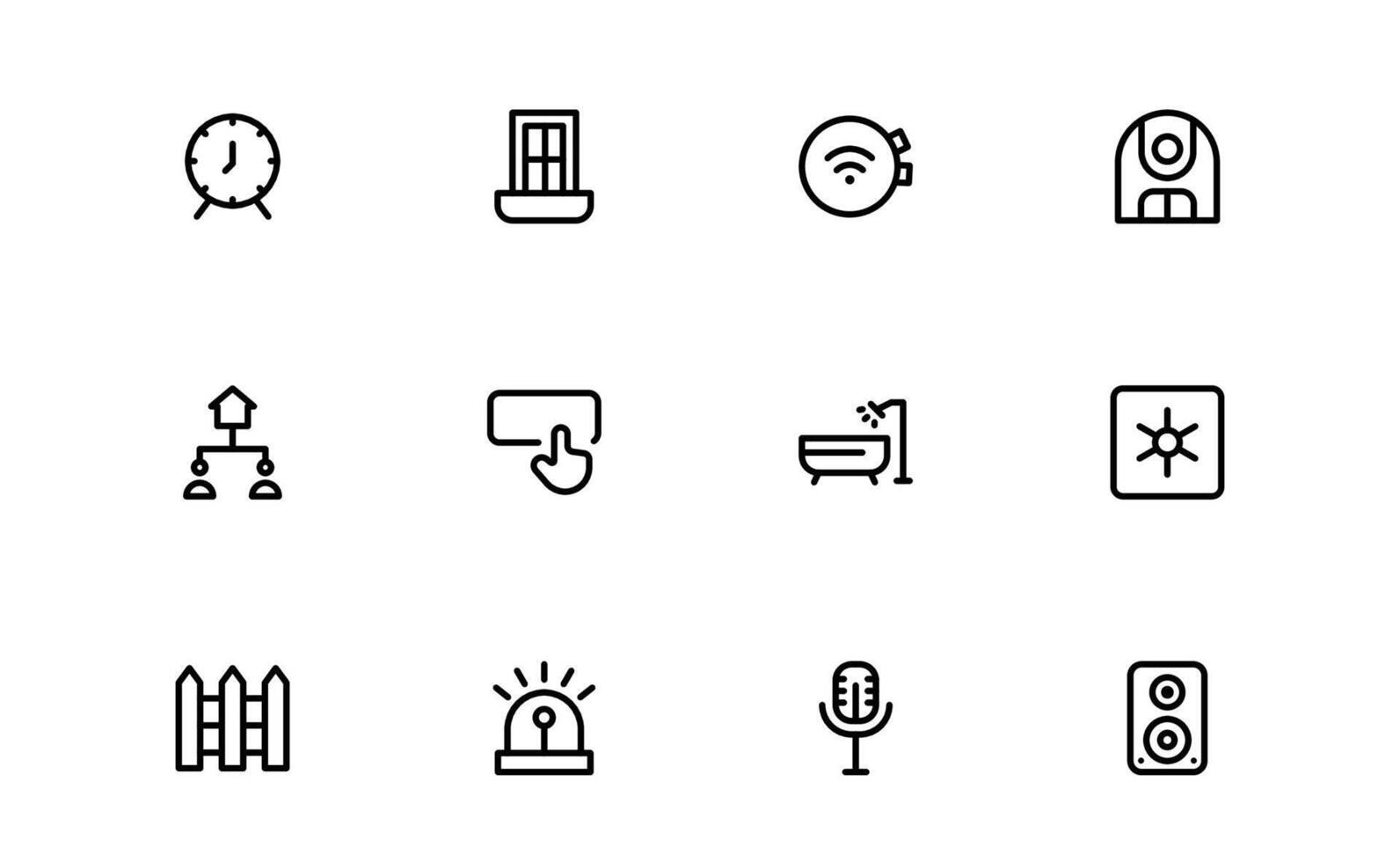 Home Automation Icons with modern minimal lines for smart thermostats, lighting control, and connected devices for energy-efficient residential management. Pro Vector