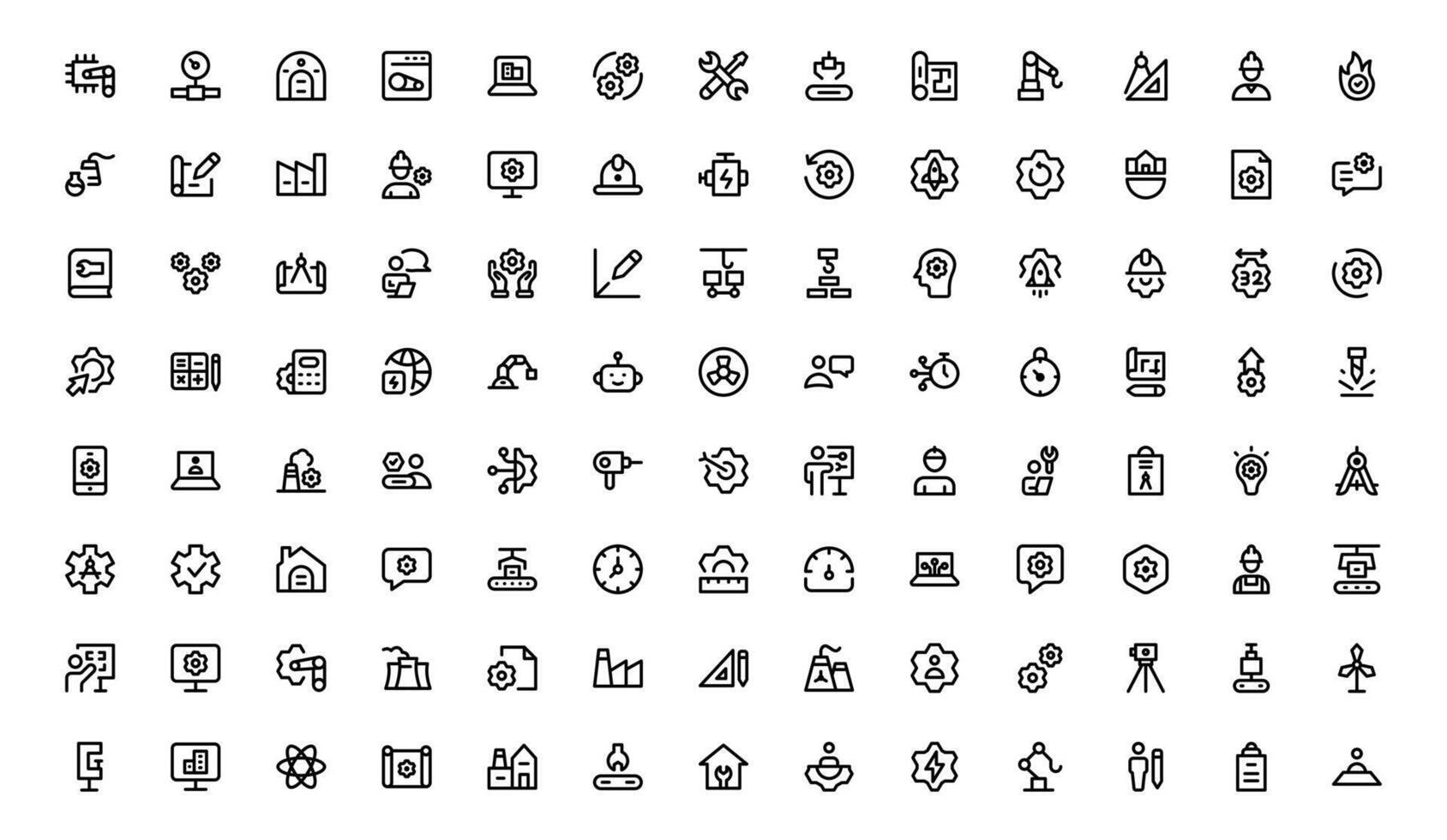 Engineering and Mechanical Icons with flat minimal outline design for industrial machinery, technical systems, and mechanical components in modern apps and websites. Pro Vector