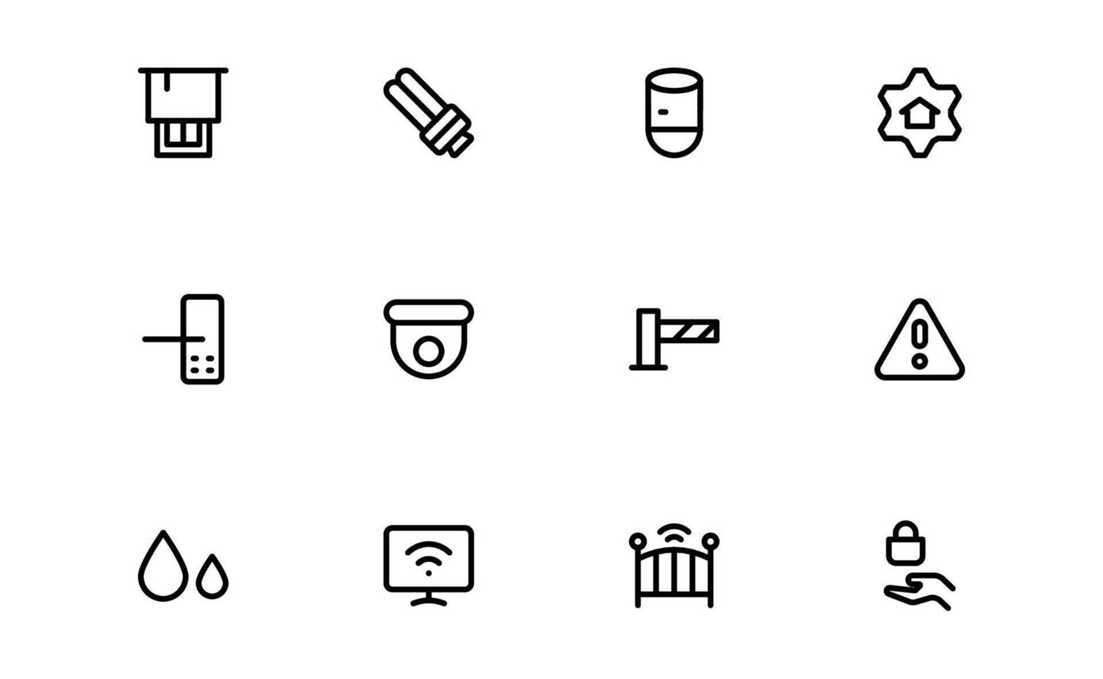 Home Automation Icons with smooth line style for intelligent lighting, thermostat control, and connected home appliances in digital and mobile interfaces. Pro Vector