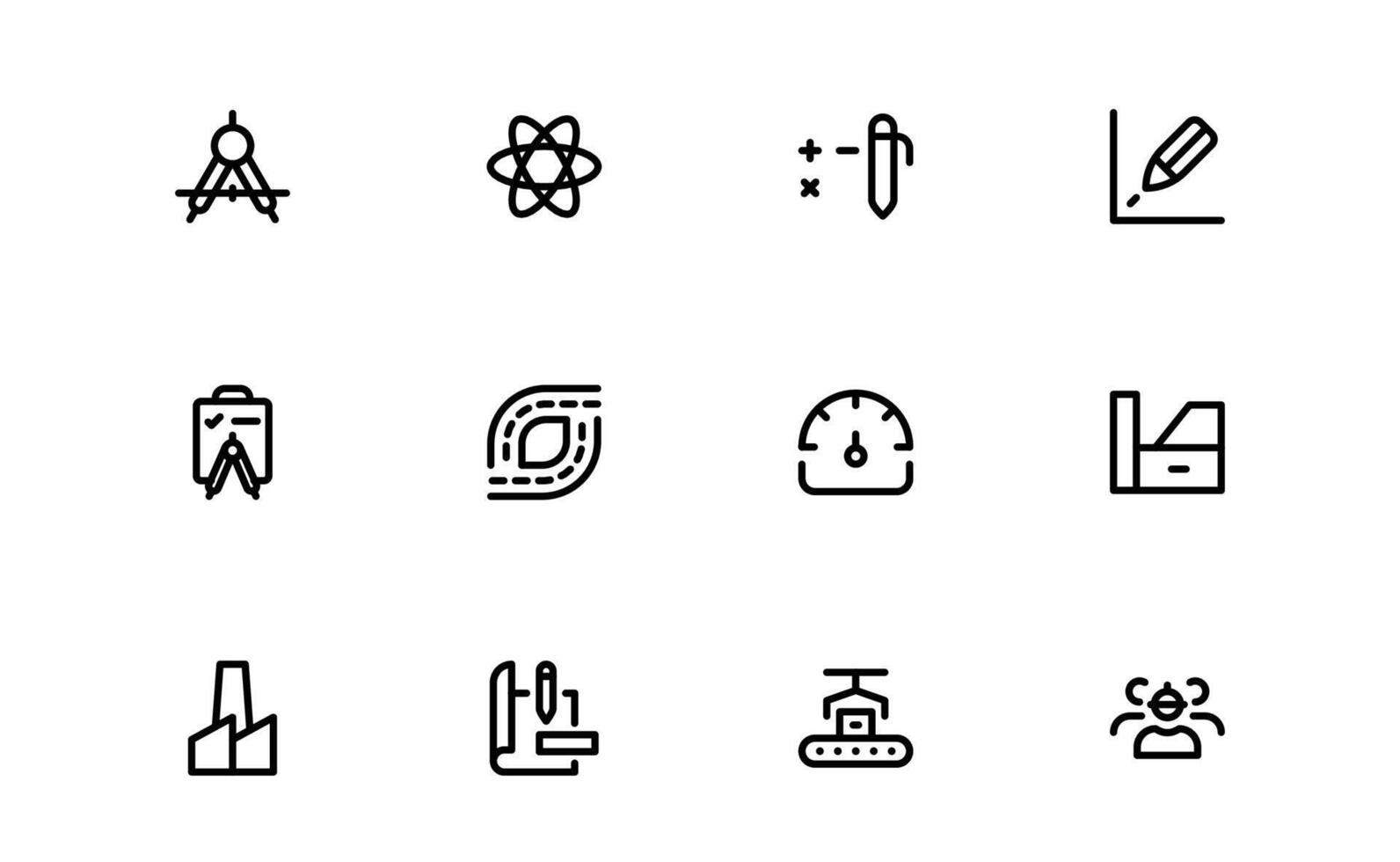 Engineering and Mechanical Icons with modern minimal outline for mechanical engineering, industrial tools, and technical process visualization in apps and websites. Pro Vector