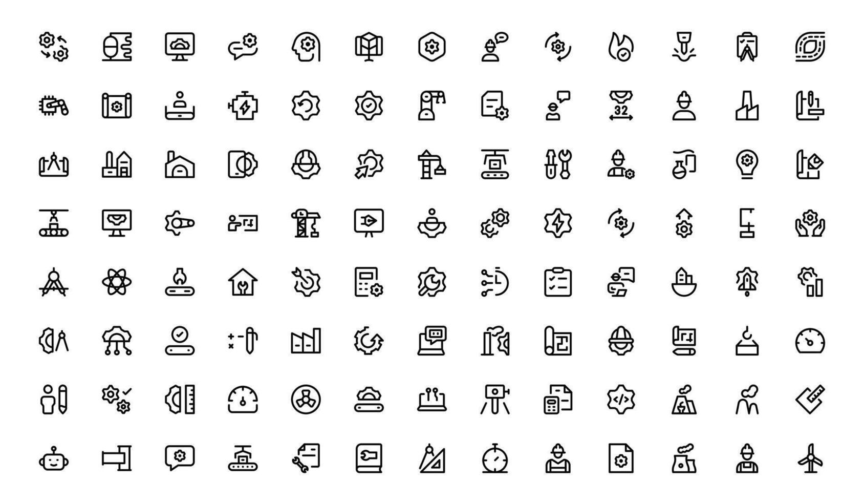 Engineering and Mechanical Icons with creative flat lines for machinery components, technical schematics, and mechanical systems in modern UI and UX designs. Pro Vector