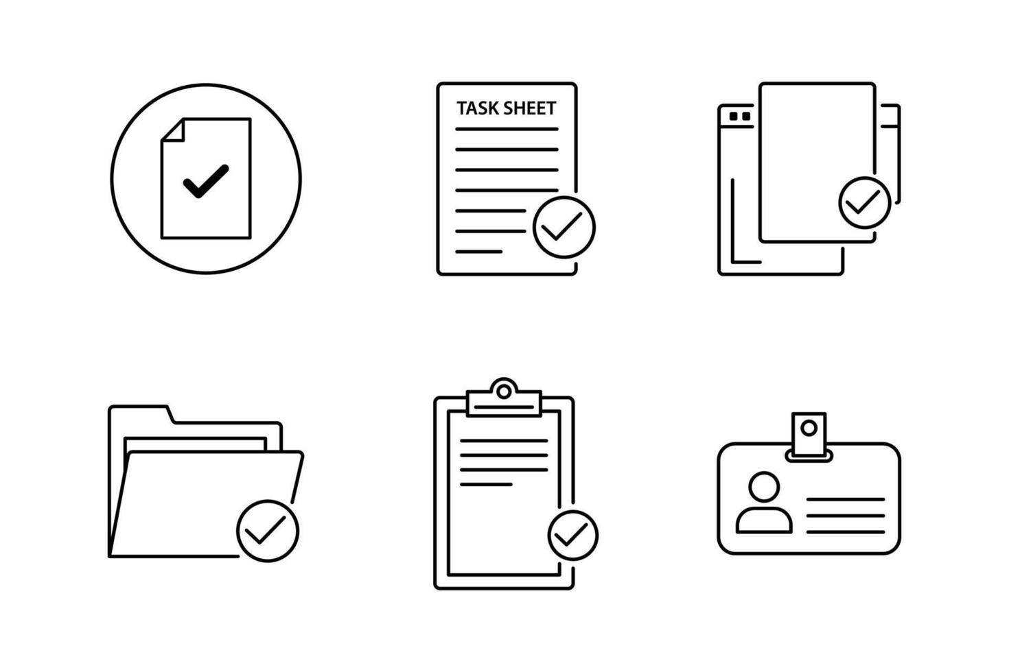 Set of outline icons depicting completed documents and tasks, including a checklist, folder, and ID card with check marks, suitable for business and office concepts vector