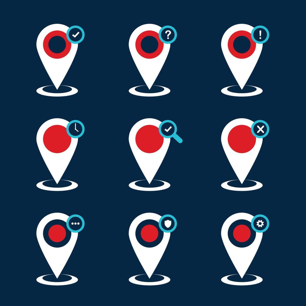 Flat design locate icon set white Add check mark, clock, magnifying glass, chat, cross, question, shield and gear Pro Vector