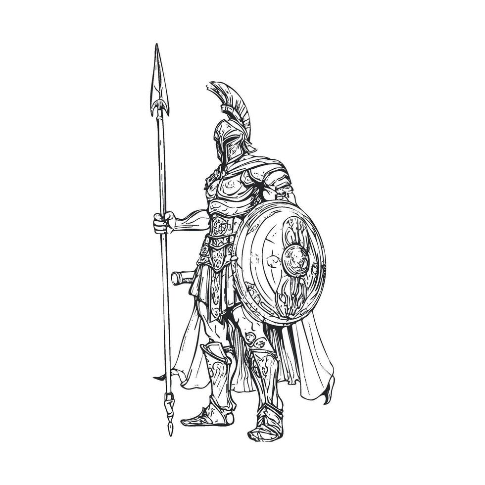 Ancient warrior with spear and shield in battle armor design for print Pro Vector