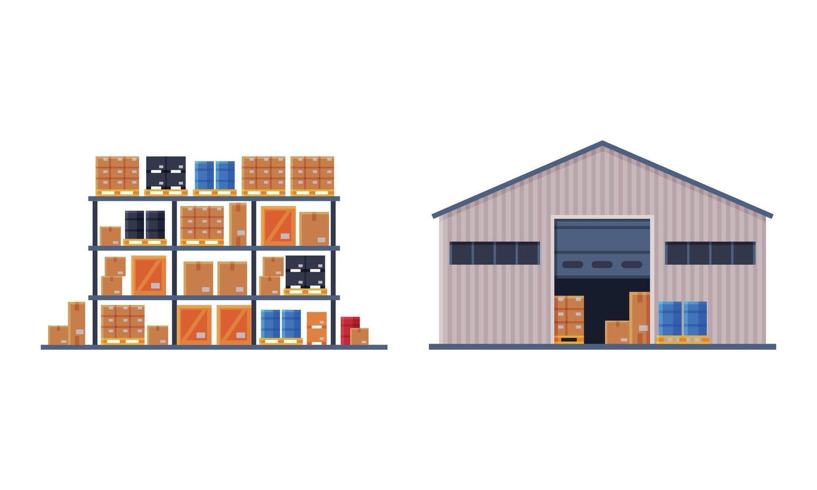 Warehouse and Rack with Crate and Box as Freight Delivering Service Set Pro Vector