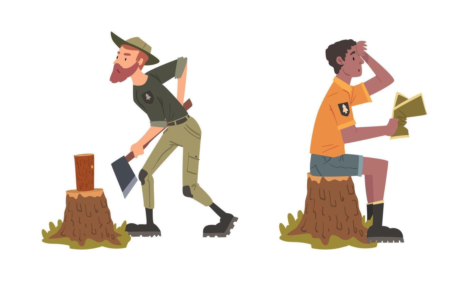 Man Forest Ranger in Uniform at National Park Sitting on Tree Stump with Map and Chopping Wood Set Pro Vector
