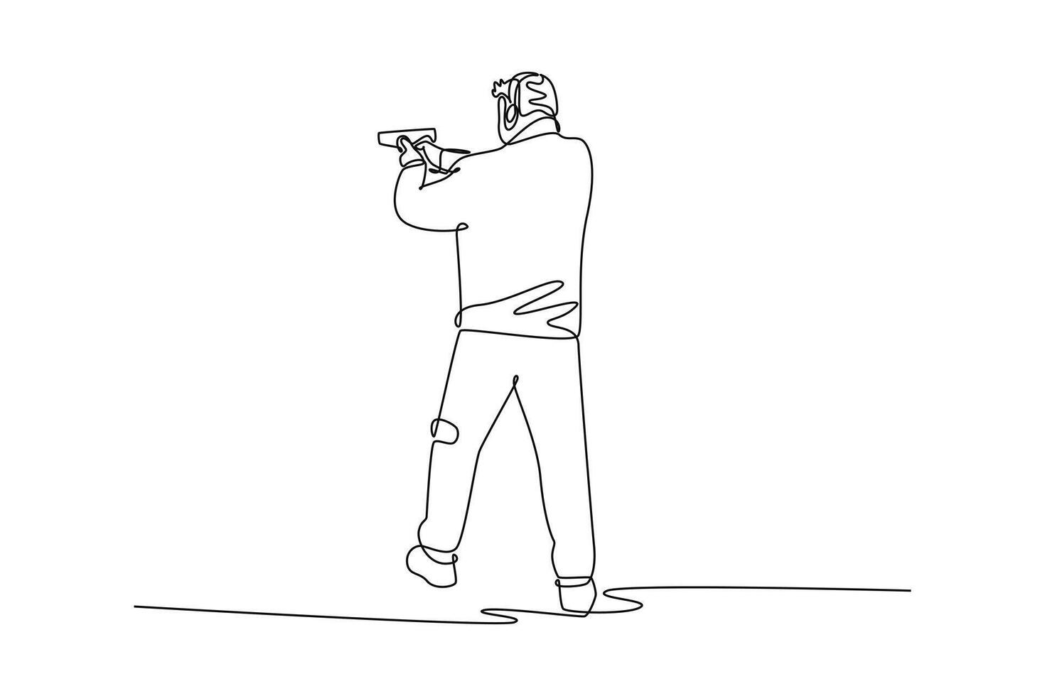 Single continuous line drawing man shooting athlete aiming pistol in stable, rear-facing stance, wearing ear protection and focused on target. Dynamic one line draw graphic design illustration Pro Vector