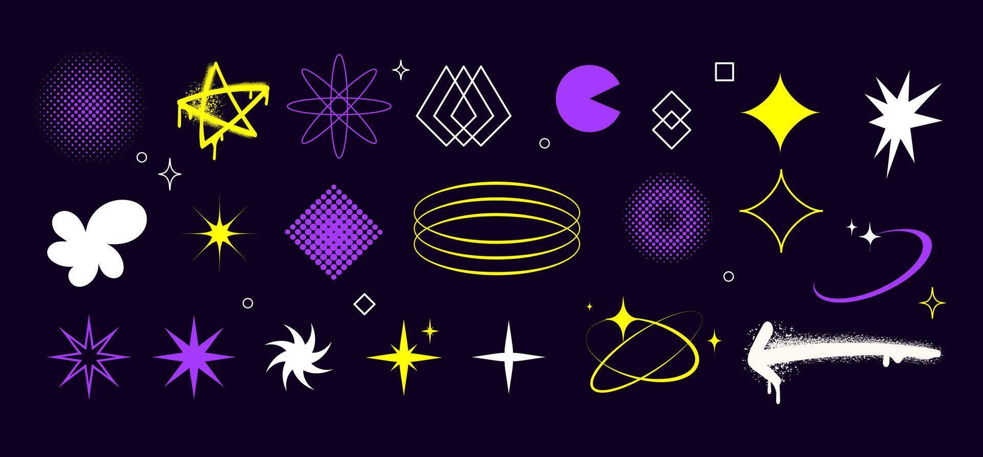 Abstract graphic shapes icon elements set, stars, sparkles, rings, glitch effects, halftone shapes on a dark background. UI UX, digital art, branding, web, motion graphics, futuristic design. Vecto Pro Vector