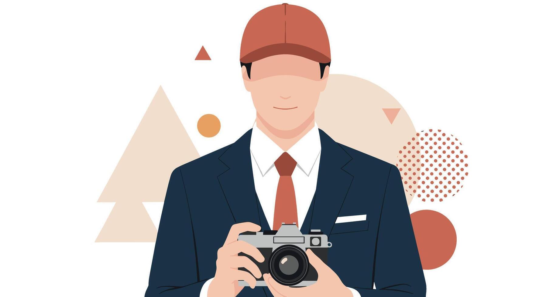 Man in Suit Holding Camera with Abstract Shapes. vector