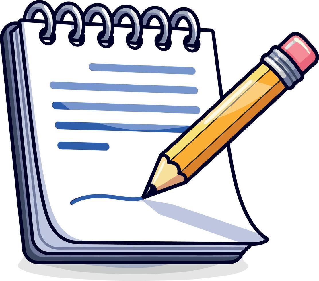 Yellow pencil writing on a spiral notebook with blue lines illustrating creativity and the process of taking notes in a bright setting vector