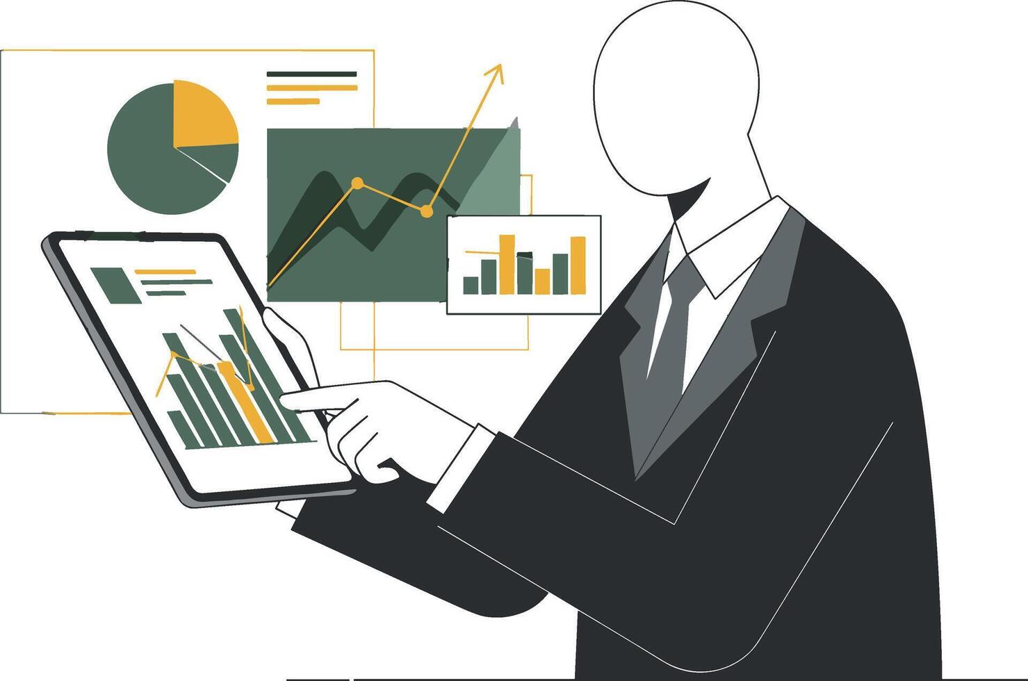Faceless businessman analyzing financial data on a tablet with charts and graphs showcasing business intelligence and data-driven decision Pro Vector