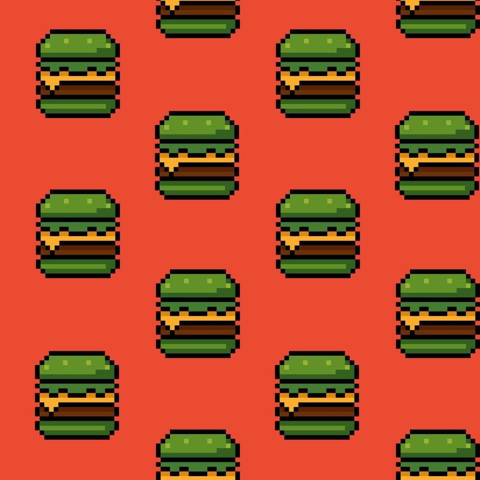 Seamless pattern with pixel art hamburgers with green bun on a red background Pro Vector