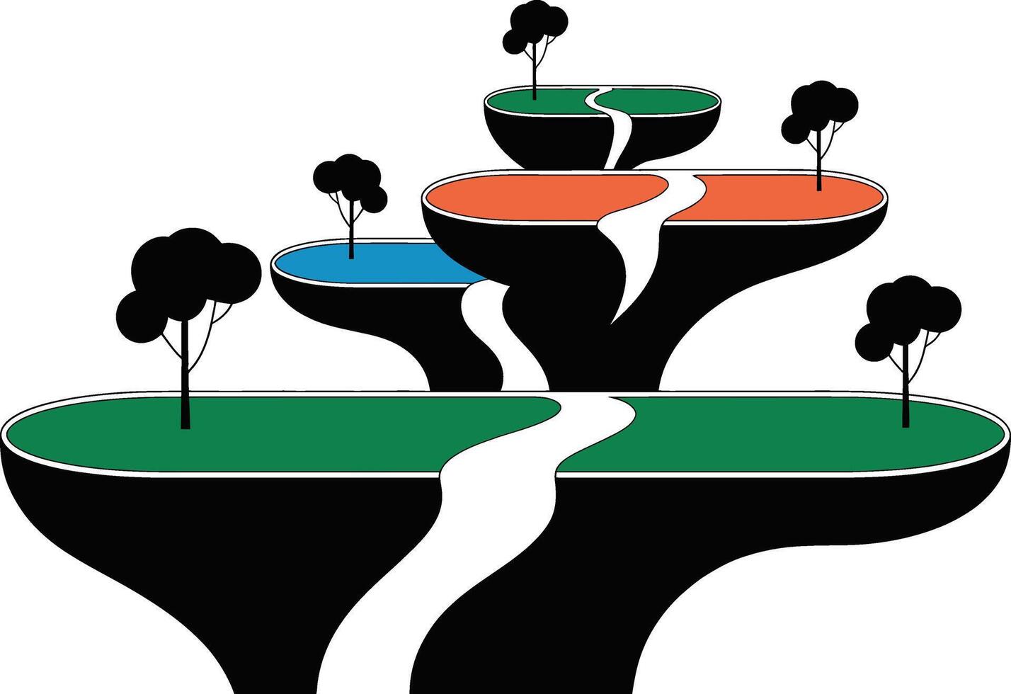 Surreal floating islands with trees and winding paths silhouette Pro Vector