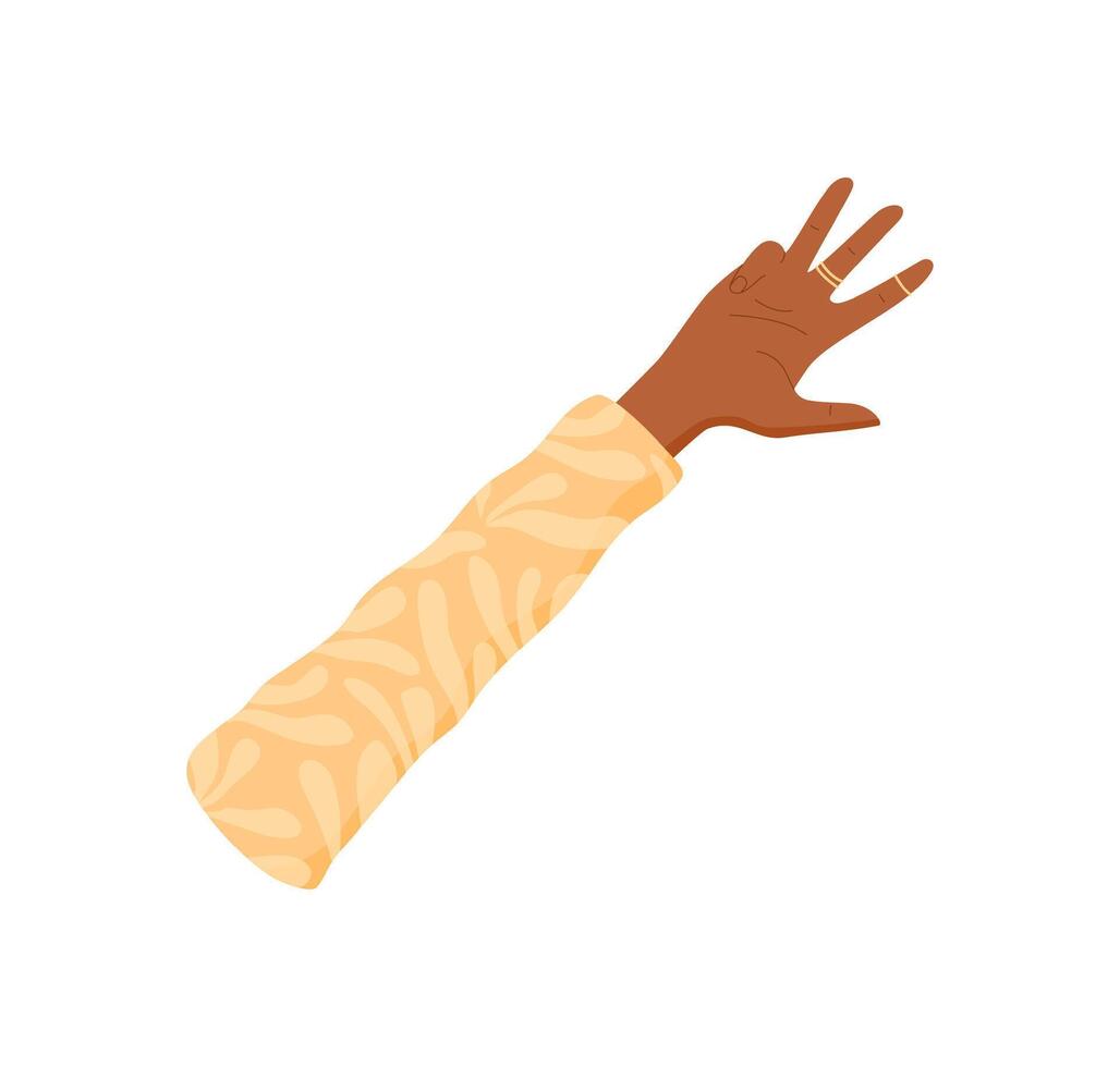Flat cartoon hand gesture with raised palm and four fingers. Gesture showing count of number 4 with upward palm. Dark hand in yellow sleeve, isolated, math education element. Pro Vector