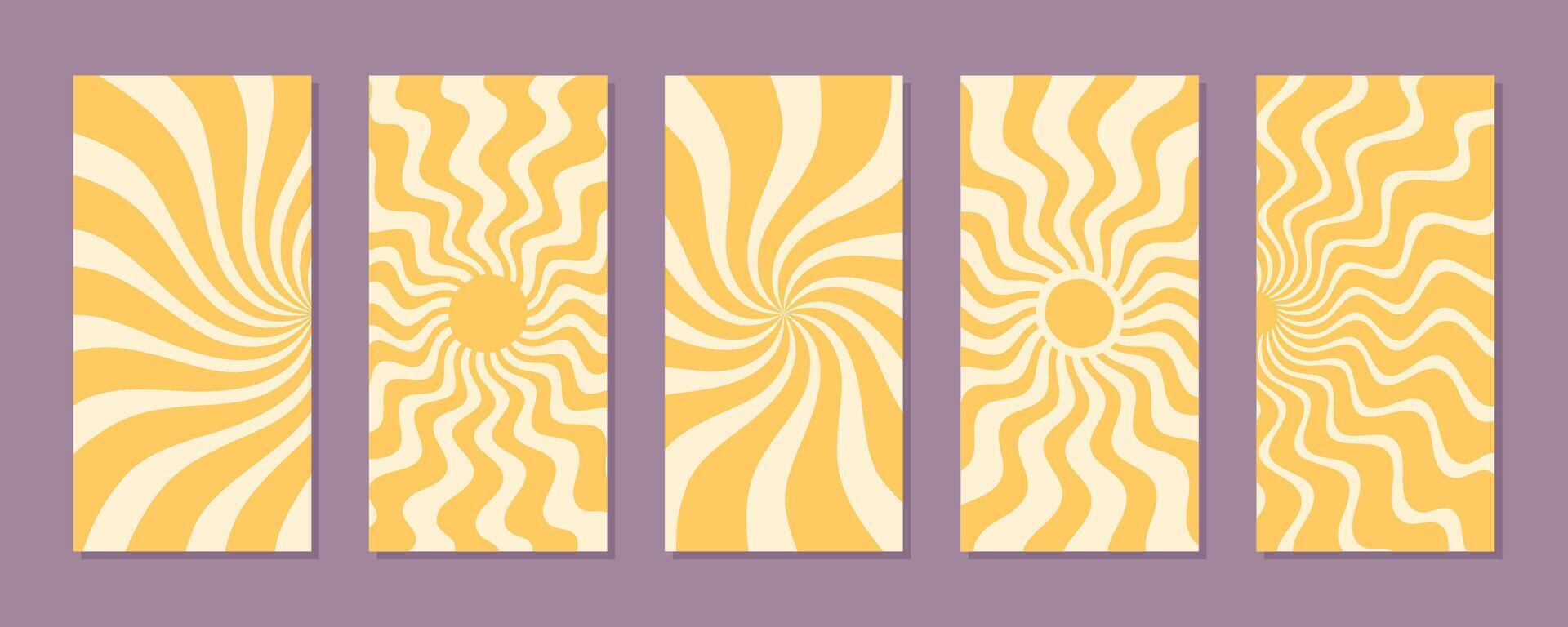 Groovy retro sun burst set with orange and yellow swirl wave shapes. Spiral sun and sunshine combine with a y2k background. Fun vertical format adds standout pop style trendy summer energy, perfect Pro Vector