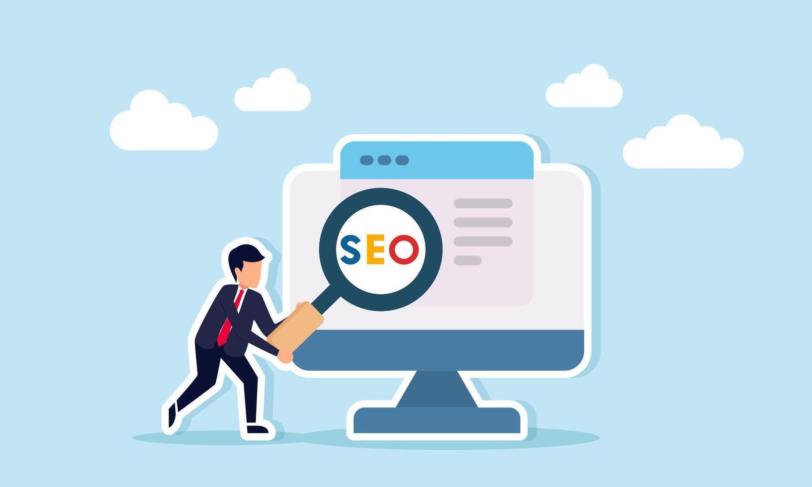Businessman using a magnifying glass to examine SEO text on a computer screen displaying an application illustration of SEO analysis to improve business performance Pro Vector