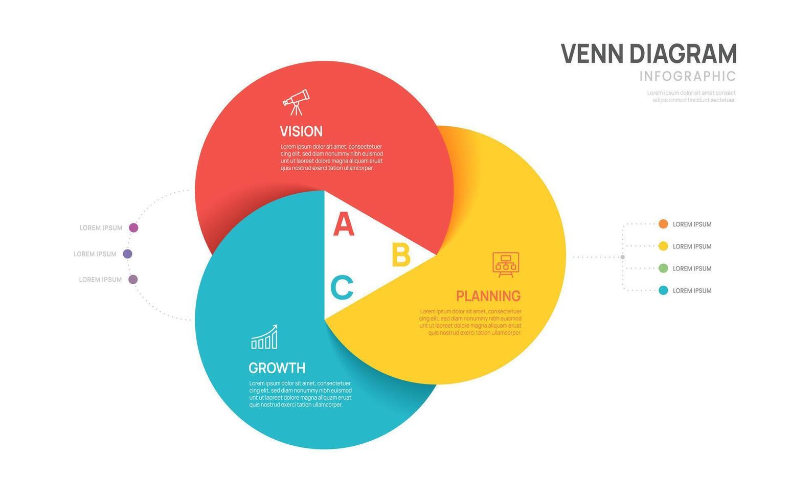 Venn diagram business infographic circle chart template 3 steps, presentation with venn diagram elements. Pro Vector