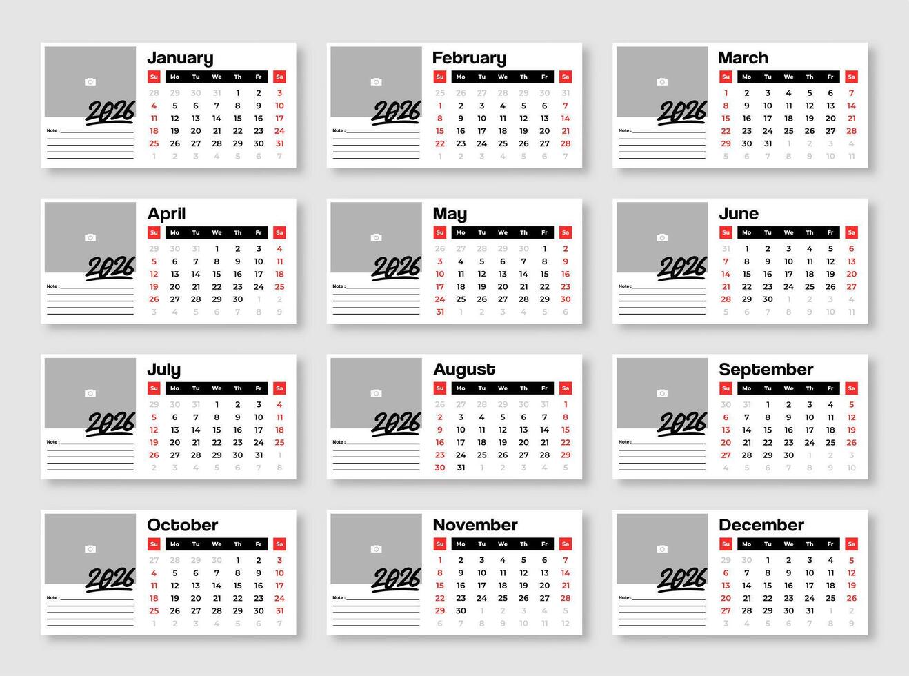 Modern minimalist 2026 yearly calendar template with clean layout. 12 months calendar template for 2026. Pro Vector