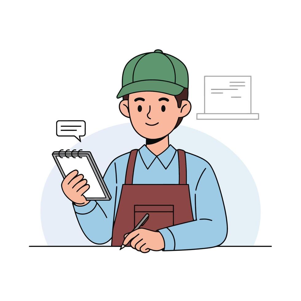 Happy worker in apron taking notes with pen on notepad, professional service Pro Vector
