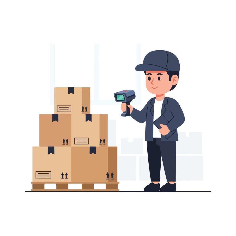 Warehouse worker scans boxes with barcode reader for inventory management Pro Vector