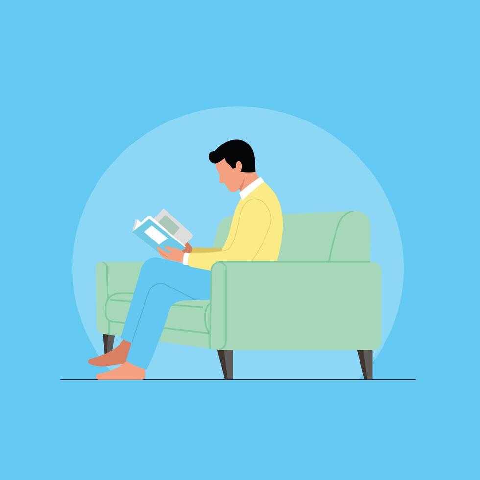 Man Reading a Book on Sofa. Pro Vector