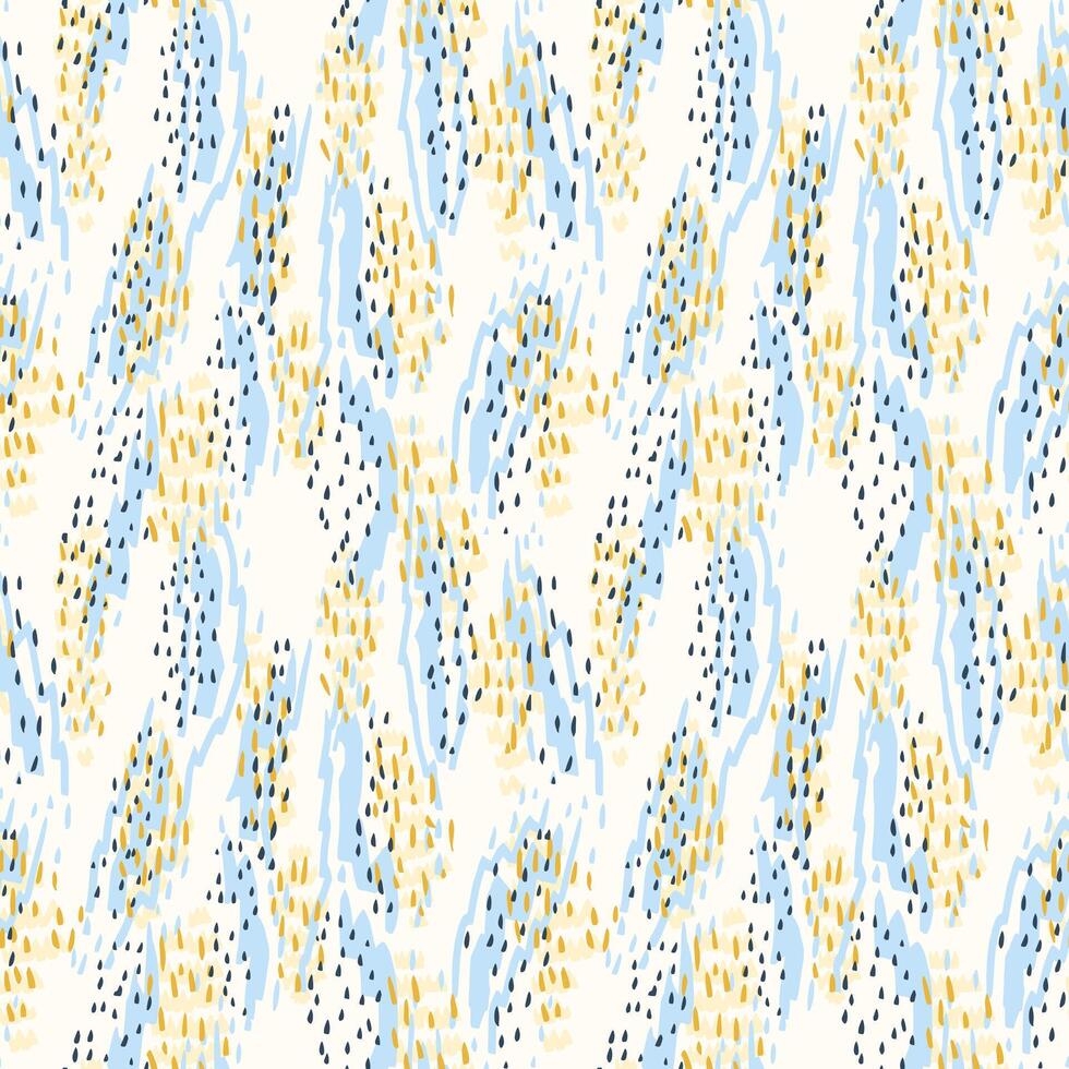 Seamless abstract pattern with playful organic shapes in blue, yellow, and black on a white background. Modern hand drawn texture for fabric, wrapping, and surface design vector