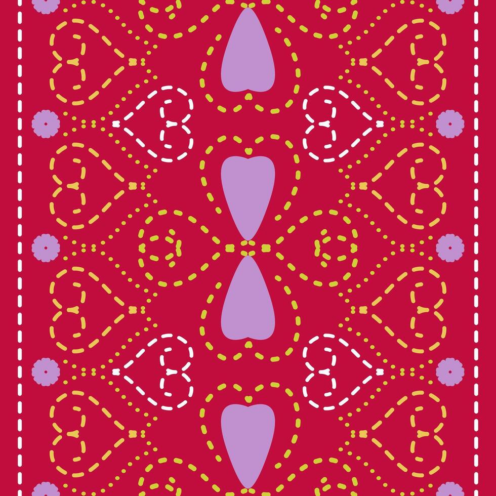 Luxurious baroque inspired pattern in vivid red with lavender heart shapes and golden dotted lines. The intricate ornamental symmetry makes it perfect for textile design, invitations, royal themed Pro Vector