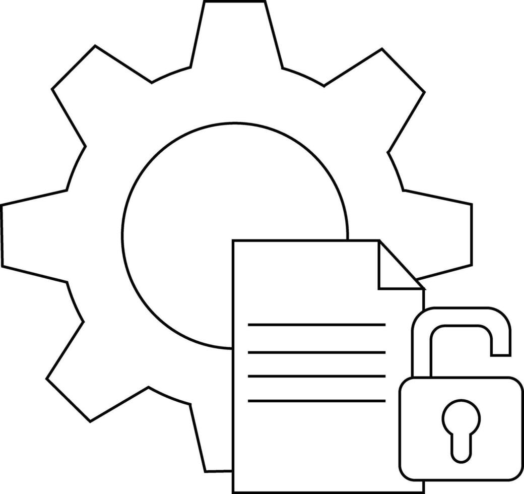 A gear document with lines and open padlock are depicted in a monochrome line drawing vector
