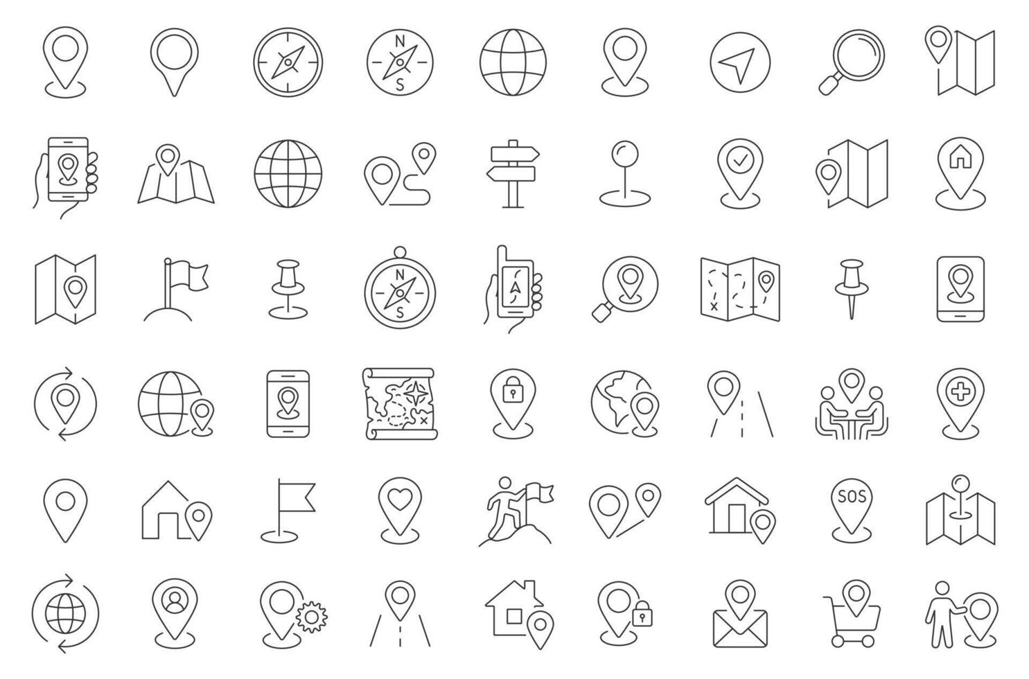 Location And Navigation Line Icon Set. A Collection Of 54 Thin Line Editable Stroke Icons Representing Map Pins, GPS, Compass, Direction, And Travel Symbols. Perfect For Maps, Apps. Isolated Pro Vector