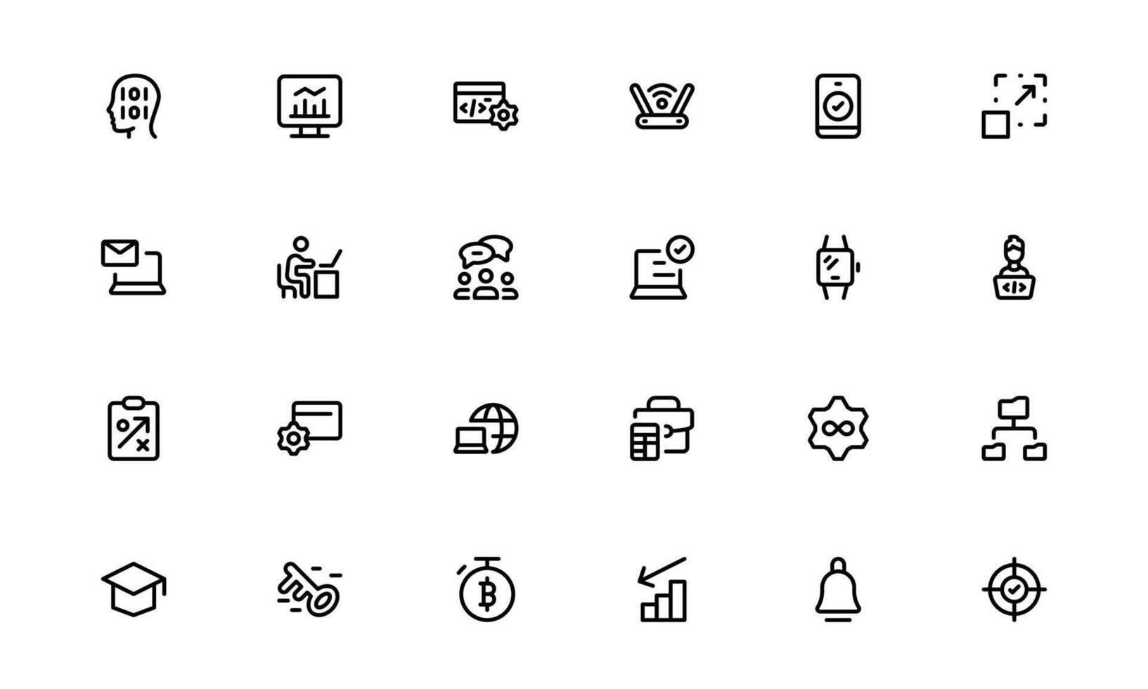 Modern Technology and Development Icons with creative flat lines for AI tools, programming visuals, and system design in modern UI and UX projects. Pro Vector