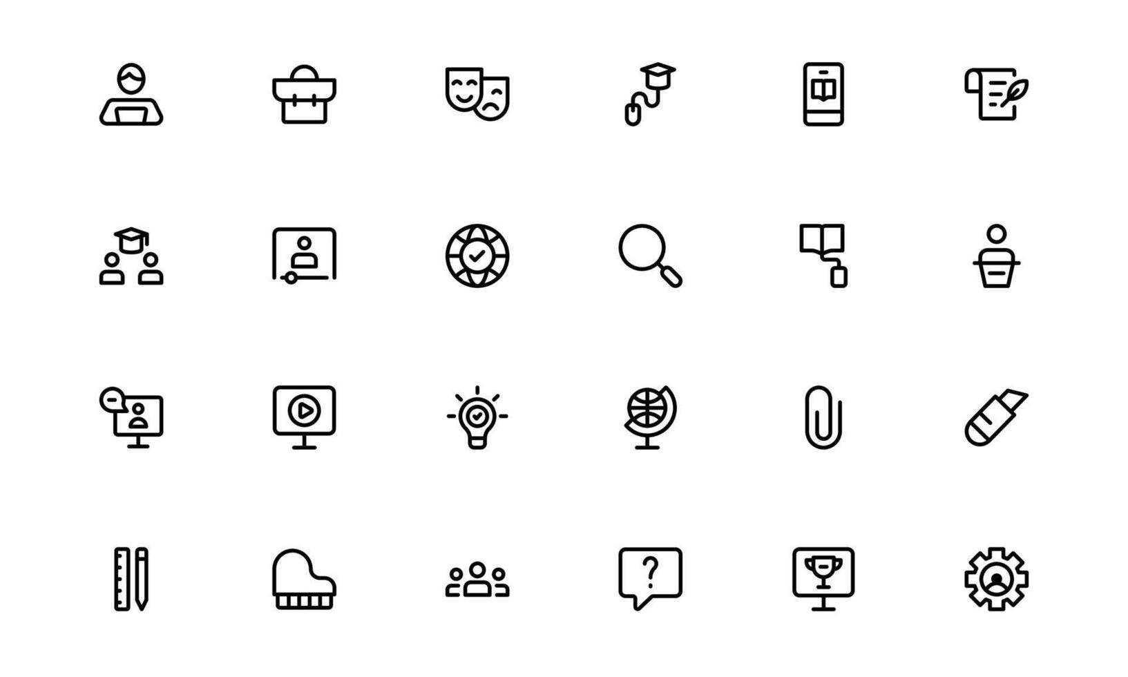 Modern Education Tools Icons with smooth flat lines for virtual classrooms, student tools, and e-learning systems in websites and mobile apps. Pro Vector