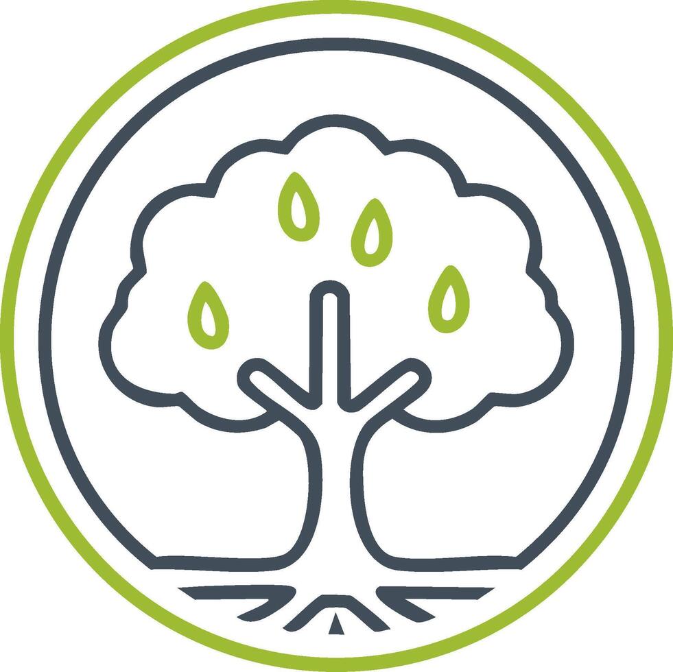 Modern line art icon of a fruit tree with roots in a circular emblem symbolizing growth and ecology Pro Vector