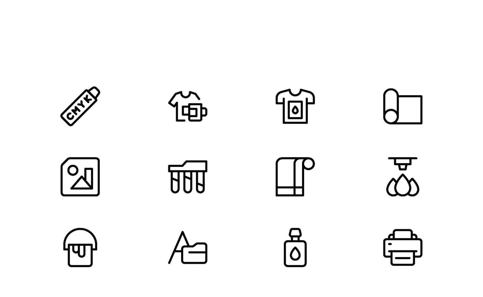 Printing Equipment and Process Line Icon Set with detailed, minimal symbols representing printers, ink, and paper elements. Pro Vector