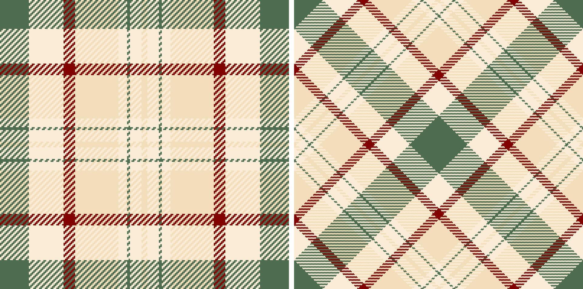 Elegant textile pattern featuring classic tartan. Design elements include intersecting green, red and beige lines creating plaid. Ideal for fashion, backgrounds, gift wrapping. Pro Vector