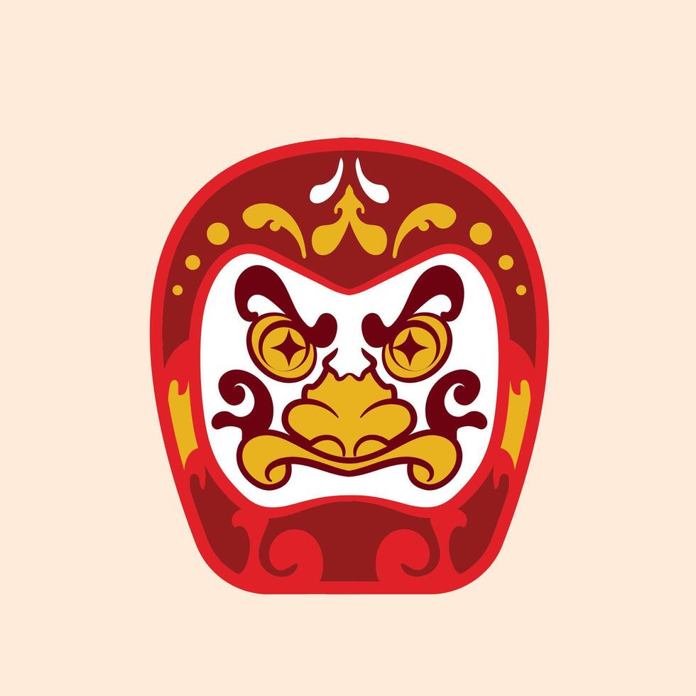 Japanase Daruma Doll with cheerful expression, bold eyebrows, yellow decorative patterns, red dot on forehead and expressive face, symbolizing perseverance and good luck vector