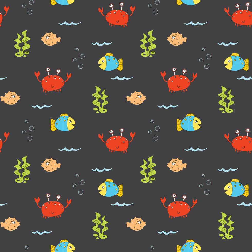Seamless pattern with crabs and fish on a dark background Pro Vector