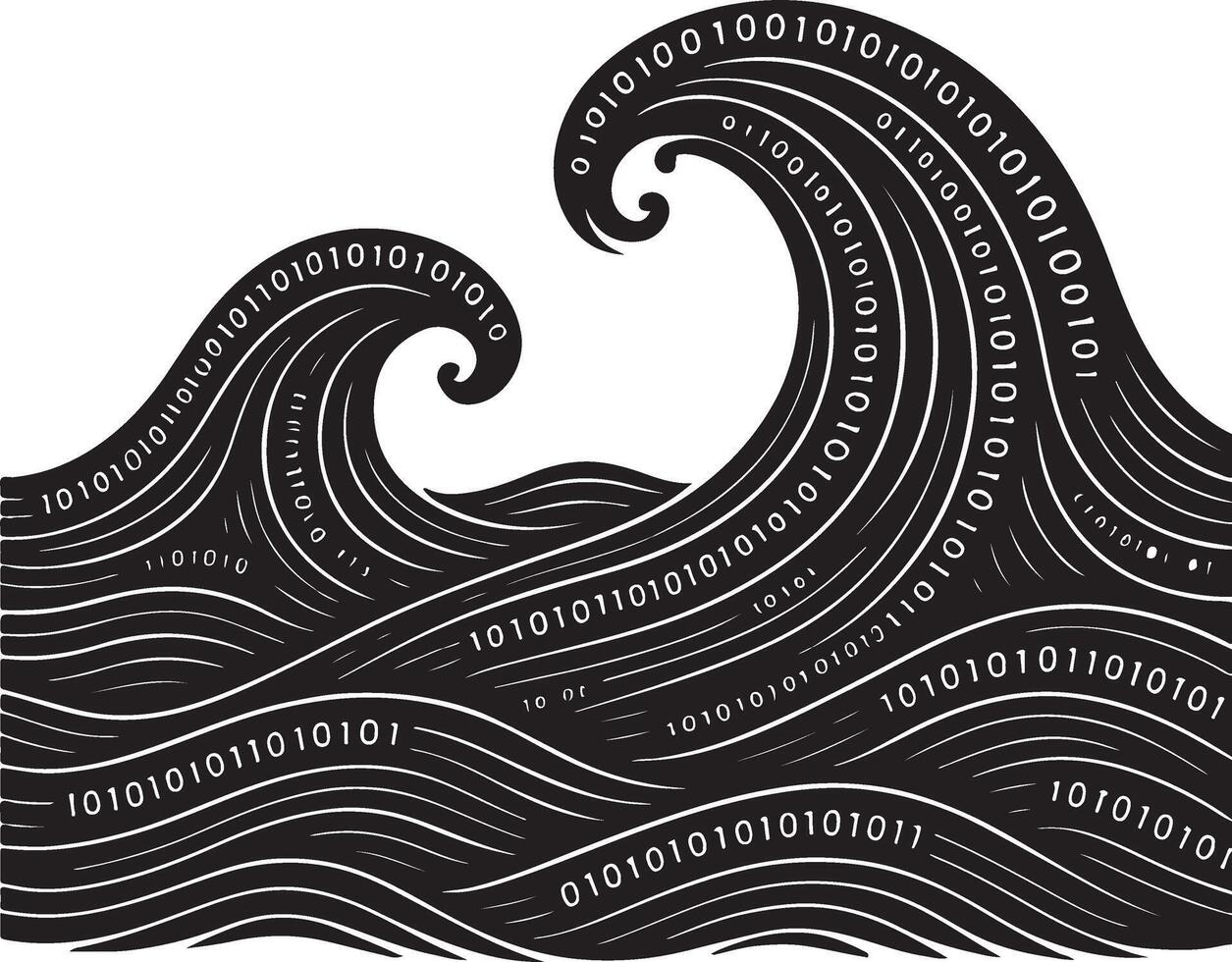Virtual Ocean Waves Minimalist Silhouette art Merging Nature Movement and Binary Digital Flow Pro Vector